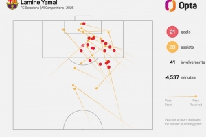 Opta指出,五大聯(lián)賽球員之中,僅亞馬爾、奧利塞2025年各賽事進球20+且助攻20+,其中亞馬爾21球20助,奧利塞21球24助。