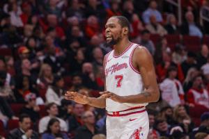 在12月份,杜蘭特合計(jì)出戰(zhàn)13場(chǎng)比賽(全勤),場(chǎng)均26.6分5籃板5.4助攻1.3蓋帽,三項(xiàng)命中率分別是55%、49.2%和90.0%,正負(fù)值合計(jì)+79。