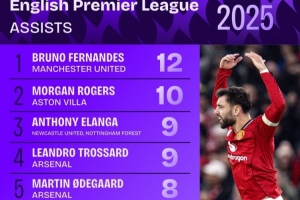 體育資訊1月1日訊 Squawka統(tǒng)計2025年英超球員助攻次數(shù)榜,B費12次居首,摩根·羅杰斯10次第二。