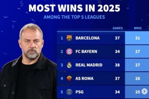 體育資訊1月1日訊 2025年已經結束,《轉會市場》也統(tǒng)計了本年度五大聯(lián)賽勝場最多情況,巴薩獨自居首。