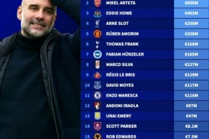 體育資訊1月1日訊 切爾西主帥馬雷斯卡在新年當天離任,德國轉(zhuǎn)會市場盤點了英超主帥引援凈投入排行,瓜迪奧拉10.3億歐居首,馬雷斯卡1.16億歐位居第11位。