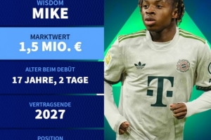 體育資訊9月28日訊 在本輪德甲拜仁4-0大勝不萊梅的比賽中,17歲小將麥克替補(bǔ)登場(chǎng)迎來(lái)一線(xiàn)隊(duì)首秀。