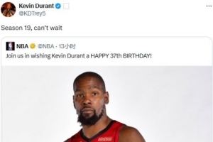 杜蘭特轉(zhuǎn)發(fā)了NBA官方的推文,并配文道:迫不及待開啟生涯第19個賽季了。