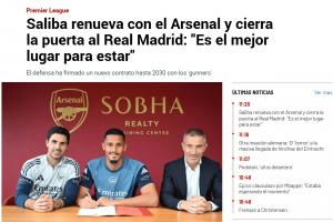 《阿斯報(bào)》的題目則是《官方:皇馬錯(cuò)過(guò)薩利巴,阿森納官宣與法國(guó)中衛(wèi)續(xù)約至2030年,這名球員原本在皇馬的引援計(jì)劃中》