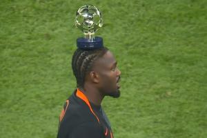 體育資訊10月01日訊 歐冠聯(lián)賽階段第2輪,國際米蘭主場3-0戰(zhàn)勝布拉格斯拉維亞,賽后圖拉姆當(dāng)選全場最佳,他還將全場最佳的獎杯頂在頭頂。