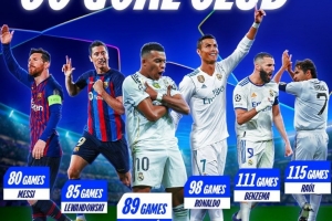 歐冠官方也盤點(diǎn)了歷史上打進(jìn)歐冠60球最快用時(shí)場(chǎng)次榜,具體如下:
