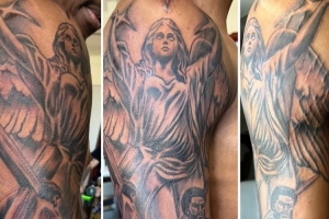 他在靠近肩膀處加上了一個天使圖案,往下是大衛(wèi)與歌利亞的場景,以及耶穌扛著十字架的圖案。