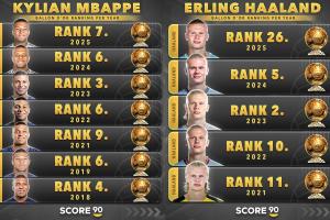 姆巴佩/哈蘭德歷年金球獎(jiǎng)排名對(duì)比:
