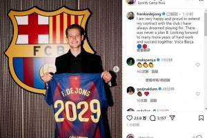 德容社媒曬出手拿續(xù)約紀(jì)念球衣的照片,配文:“我非常高興和自豪能夠與我一直夢想效力的俱樂部續(xù)約。我從來就沒有B計劃,期待在未來更多年里與大家共同努力、共創(chuàng)輝煌,巴薩萬歲?!?/p>