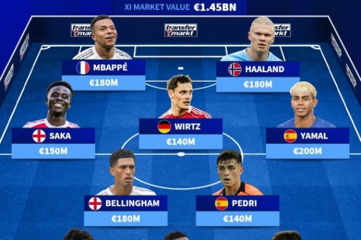 體育資訊10月16日訊 德轉(zhuǎn)盤點了歐足聯(lián)球員的最高身價陣容,整套陣容總價值高達(dá)14.5億歐元。其中巴薩小將亞馬爾以2億歐元成為身價最高的球員,姆巴佩、哈蘭德和貝林厄姆均以1.8億歐元并列第二。