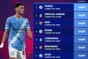 體育資訊10月25日訊 德轉(zhuǎn)盤點(diǎn)了在2025年足壇球員身價(jià)跌幅榜,其中福登下跌6000萬歐最多,以下為具體榜單: