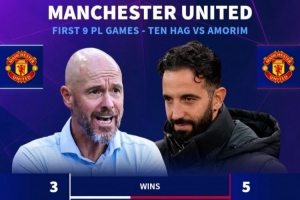 24-25賽季,滕哈赫帶隊(duì):前9輪3勝2平4負(fù),積11分,場均1.22分,聯(lián)賽第14位