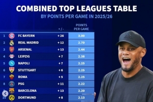 體育資訊10月28日訊 《轉(zhuǎn)會(huì)市場(chǎng)》更新了本賽季五大聯(lián)賽球隊(duì)的場(chǎng)均拿分情況,拜仁、皇馬、阿森納分列前三。