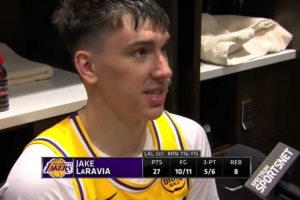體育資訊10月30日訊 湖人客場(chǎng)116-115絕殺森林狼,賽后,湖人球員拉拉維亞接受媒體采訪(fǎng)。