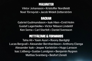 中前場:塔哈-阿里(馬爾默)、阿亞里(布萊頓)、巴德吉(巴薩)、貝里瓦爾(熱刺)、伯恩哈德森(荷爾斯泰因基爾)、伊蘭加(紐卡)、伊薩克(利物浦)、卡爾斯特羅姆(烏迪內(nèi)斯)、雨果-拉爾森(法蘭克福)、利德伯格(達姆施塔特)、倫德格倫(加爾斯)、本杰明-尼格倫(凱爾特人)、斯萬伯格(沃爾夫斯堡)、澤尼利(埃弗斯堡)