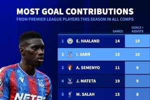 體育資訊11月7日訊 德國轉會市場統(tǒng)計了英超球員本賽季各賽事的參與進球數(shù)量,并列出榜單,哈蘭德參與19球居首,薩爾參與10球次席。