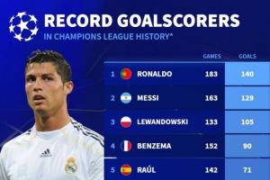 體育資訊09月16日訊 今夜,新賽季歐冠就將打響。德轉(zhuǎn)在賽前列出了歐冠歷史射手榜,C羅以140球位列榜首,梅西129位列第二,萊萬(wàn)105球第三。