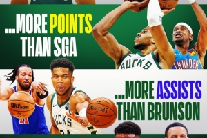 美媒Clutchpoints列出了有趣的對(duì)比,比得分字母哥場(chǎng)均得分高于亞歷山大的33分,比助攻多過(guò)布倫森的6.1次,比三分命中率他比庫(kù)里的38.9%要高(字母哥場(chǎng)均出手為1.6次)。