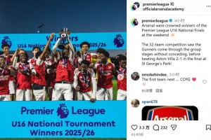 體育資訊11月11日訊 英超官方宣布,阿森納U16梯隊在上周末問鼎英超U16全國錦標賽冠軍。