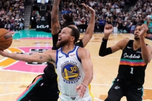 文班到三分線去追庫(kù)里,被庫(kù)里直穿籃下造罰球;瓦塞爾繞掩護(hù)細(xì)節(jié)不好,被庫(kù)里要到三罰球:半節(jié)庫(kù)里三個(gè)三分9個(gè)罰球,內(nèi)外開花,馬刺防守崩壞: