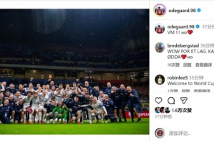 厄德高因傷缺席本場(chǎng)比賽,賽后他在社交媒體上曬出挪威隊(duì)大合照,慶祝球隊(duì)出線,配文:“世界杯!”