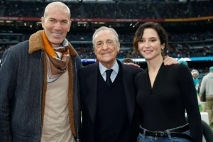 邁阿密海豚和華盛頓指揮官在伯納烏進行了NFL在西班牙的首場比賽,賽前,弗洛倫蒂諾走上球場,與馬德里自治區(qū)主席伊莎貝爾·迪亞斯·阿尤索以及皇馬傳奇齊達內(nèi)合影。