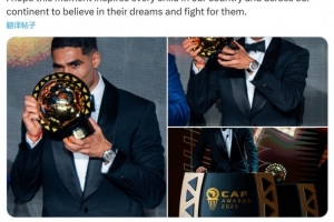 體育資訊11月20日訊 阿什拉夫當(dāng)選2025年非洲足球先生,他在社交媒體上曬出領(lǐng)獎(jiǎng)?wù)掌l(fā)表獲獎(jiǎng)感言。