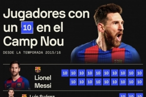 體育資訊11月22日訊 巴薩即將重返諾坎普,Sofascore統(tǒng)計(jì)了2015-2016賽季以來(lái)球員在諾坎普球場(chǎng)比賽中獲評(píng)10分的場(chǎng)次,并列出榜單,梅西19場(chǎng)居首。