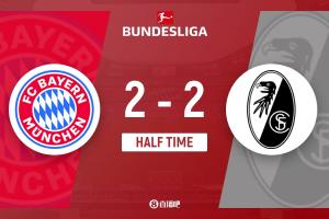 上半場傷停補(bǔ)時(shí)3分鐘,半場結(jié)束,拜仁暫2-2弗賴堡。