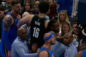 GIF-雷霆開(kāi)拓者沖突 楊瀚森過(guò)來(lái)把哈滕勸走