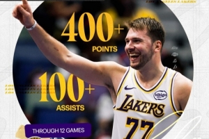 此役過(guò)后,東契奇本賽季出戰(zhàn)12場(chǎng)已達(dá)成400分100助,成為歷史上單賽季達(dá)此數(shù)據(jù)最快的球員。