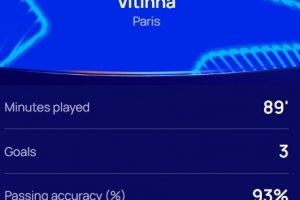 本場(chǎng)比賽維蒂尼亞上演帽子戲法,賽后他也當(dāng)選歐冠官方評(píng)選出的本場(chǎng)比賽最佳球員。