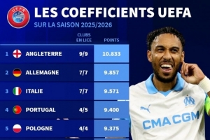 體育資訊11月29日訊 德國轉(zhuǎn)會(huì)市場(chǎng)列出了本賽季歐戰(zhàn)積分排名,英超、德甲前兩位,意甲升至第三位。