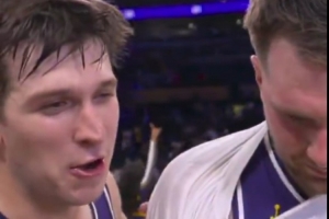 賽后東契奇接受采訪時里夫斯搶鏡:“我現在扣籃次數比他多。”