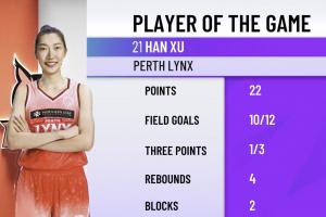 韓旭此役完成WNBL首秀,出戰(zhàn)28分鐘41秒,兩分9中9,三分3中1,罰球2中1,砍下并列全隊最高的22分,另外有4籃板2蓋帽。
