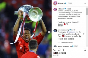 博阿滕留言回復(fù):“感謝拜仁給了我最好的時(shí)光,感謝最好的球迷,永遠(yuǎn)感恩?!?/p>