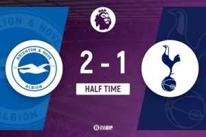 傷停補時3分鐘。上半場比賽結(jié)束,布萊頓2-1熱刺。