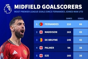 據(jù)德國轉(zhuǎn)會(huì)市場(chǎng)統(tǒng)計(jì),B費(fèi)加盟曼聯(lián)以來出戰(zhàn)210場(chǎng)英超比賽,打進(jìn)66球,同期英超進(jìn)球數(shù)量中場(chǎng)球員之中最多。