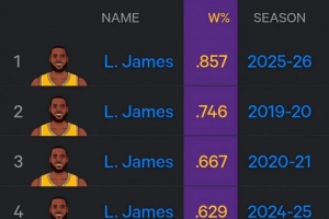 本賽季詹姆斯出戰(zhàn)時(shí)6勝1負(fù),86.7%的勝率暫列湖人單賽季生涯新高。