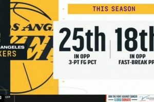 備注:湖人本賽季對(duì)手三分命中率達(dá)到37.9%(聯(lián)盟第25),聯(lián)盟防三分最好的球隊(duì)是獨(dú)行俠(32.9%)