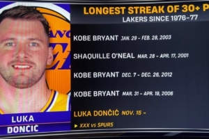 這是東契奇在湖人連續(xù)第9場砍30+,自1976-77賽季以來湖人隊史第四長,僅次于科比(16場、10場、9場)和奧尼爾(11場)。