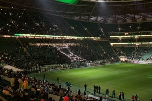 亞冠二國(guó)安戰(zhàn)麥克阿瑟賽前,北看臺(tái)球迷用手電筒組成冠軍獎(jiǎng)杯形狀