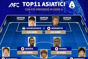 體育資訊12月13日訊 德轉(zhuǎn)列意甲出場最多的亞洲球員11人陣容,中田英壽、長友佑都、奧代羅在列。