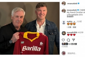 安切洛蒂獲贈自己效力羅馬期間的球衣,他在社交媒體上曬照:“我的朋友克里斯蒂安收藏了一件令人難忘的球衣?!?/p>