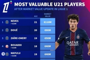 德轉(zhuǎn)列法甲U21身價榜:內(nèi)維斯壓杜埃居首,布阿迪、馬尤盧在列