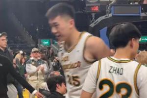 中國(guó)球員、舊金山大學(xué)后衛(wèi)趙維倫最后時(shí)刻獲得出場(chǎng)機(jī)會(huì),上場(chǎng)1分鐘沒有運(yùn)動(dòng)戰(zhàn)出手,罰球2中1,得到1分。