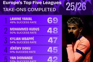 1.拉明·亞馬爾,巴塞羅那,69次 (成功率49%)