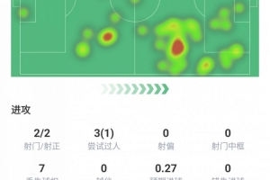 出場(chǎng)63分鐘,進(jìn)1球,射門(mén)2次,射正2次,嘗試過(guò)人3次成功1次,丟失球權(quán)7次,預(yù)期進(jìn)球0.27