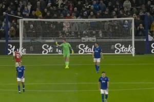 在約克雷斯罰進點球后,埃弗頓門將皮克福德很懊惱。撿起皮球怒踢一腳險些踢到薩卡,隨后還朝阿森納球員比中指。