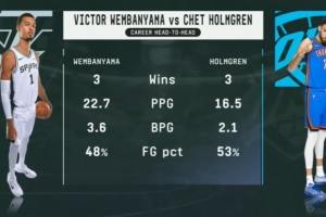 據(jù)統(tǒng)計,文班亞馬和霍姆格倫生涯至今交手6次,雙方各取3勝。